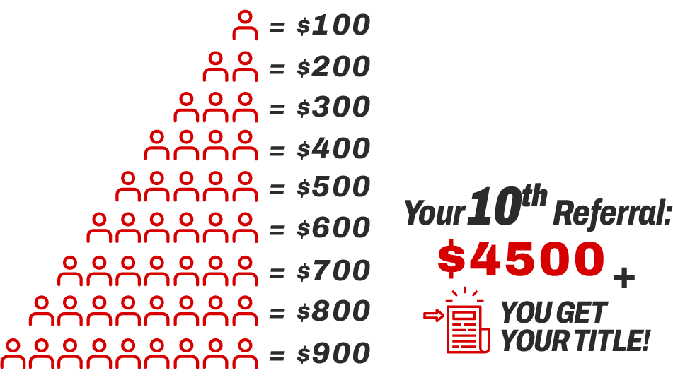 You can earn rewards for up to 10 referrals. After your 10th successful referral, you'll receive $4,500 in account credits PLUS the title to your vehicle!